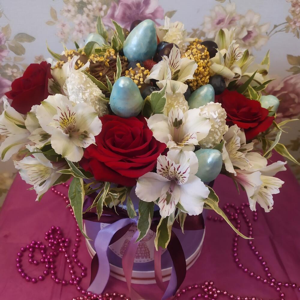 Клубника в шоколаде – 22 шт.Голубика – 15 шт.Альстромерия – 5 шт.розы алые 60 см – 5 шт.зелень декоративная – 10 шт.Шляпная коробка – 1 шт.Дизайнерская упаковка – 1 шт.
