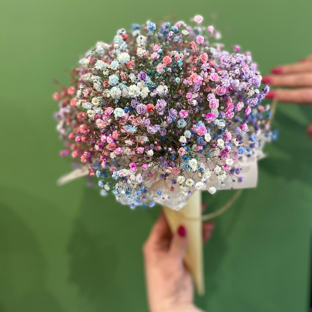 Гипсофила – 5 шт.Тишью – 1 шт.Пленка матовая – 1 шт.Губка флористическая – 1 шт.рожок декоративный – 1 шт.