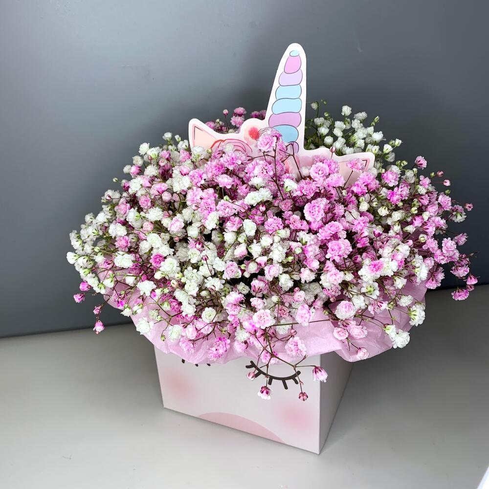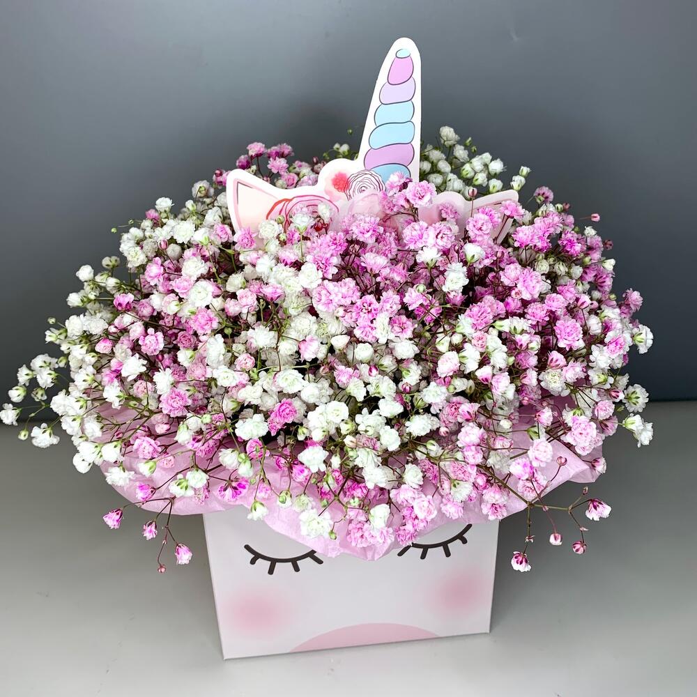 гипсофила радужная – 5 шт.Коробка – 1 шт.Топпер – 1 шт.Оазис флористический – 1 шт.Пленка прозрачная – 1 шт.Лента атласная – 1 шт.