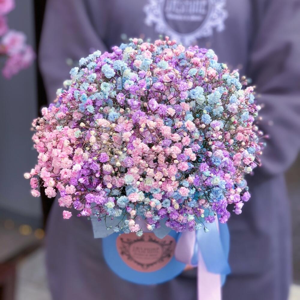 “Сиреневый туман” – композиция из гипсофилы в шляпной коробке