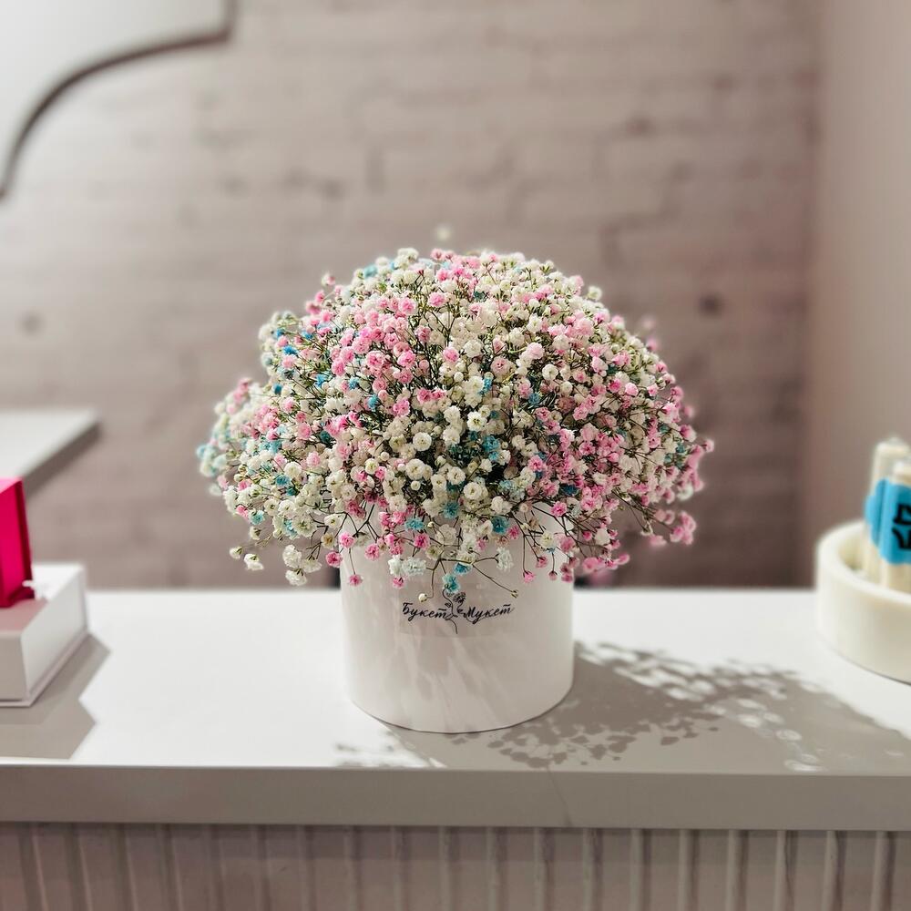 Коробка шляпная – 1 шт.Оазис флористический – 1 шт.гипсофила радужная – 4 шт.