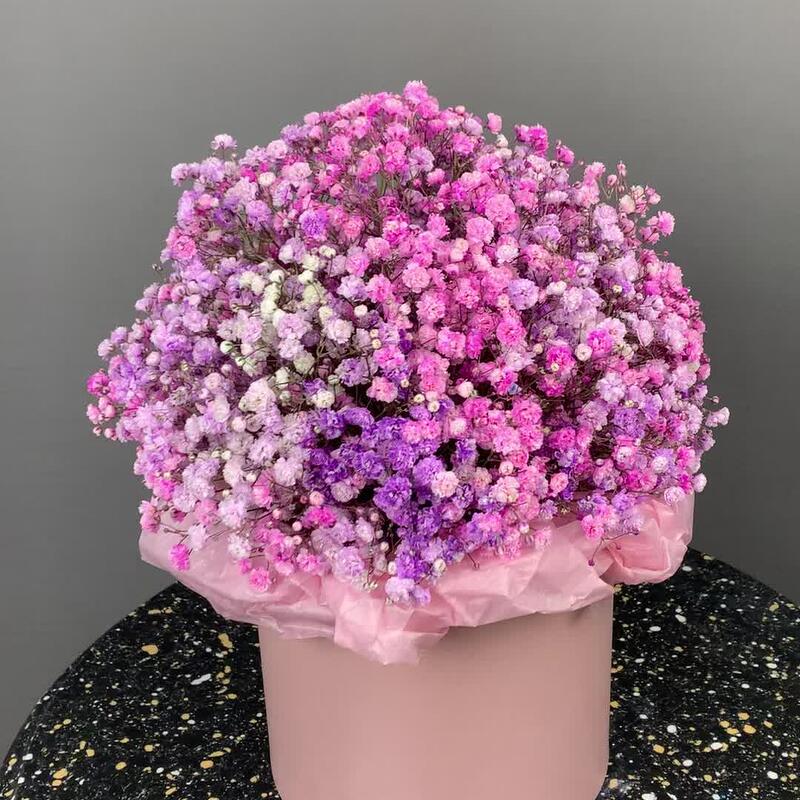 “Сиреневый туман” – композиция из гипсофилы в шляпной коробке