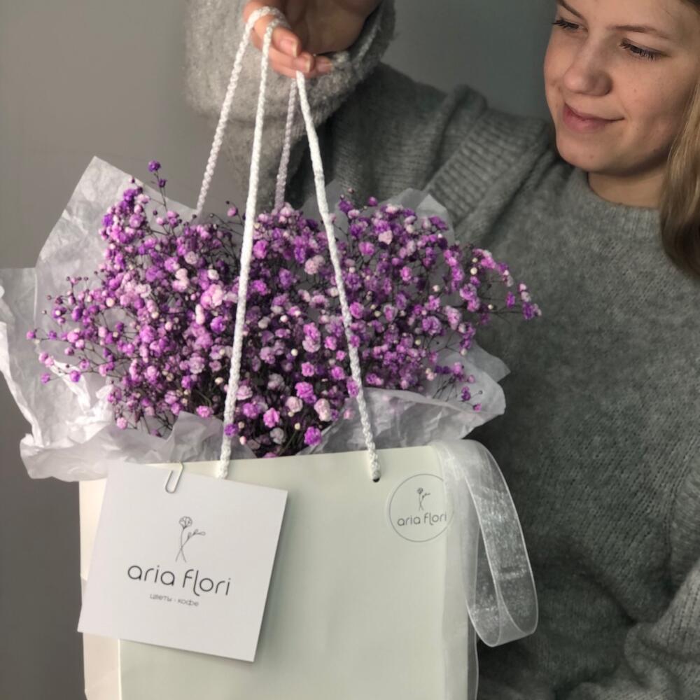 Гипсофила – 4 шт.Тишью – 2 шт.Лента Кружево – 1 шт.коробка транспортировочная – 1 шт.подкормка для срезанных цветов – 1 шт.инструкция по уходу за цветами – 1 шт.записка с вашим текстом – 1 шт.медиант ручной работы из бельгийского шоколада – 1 шт.