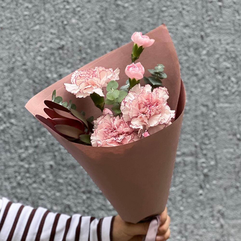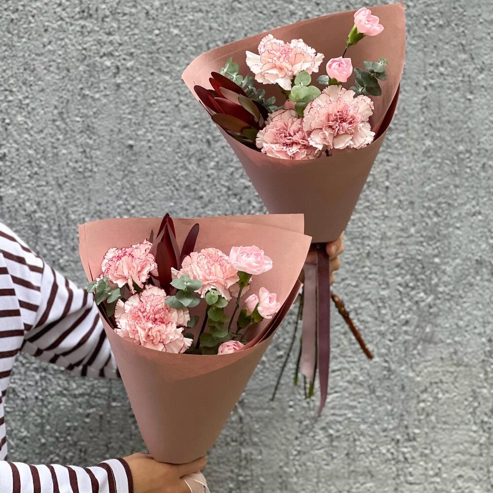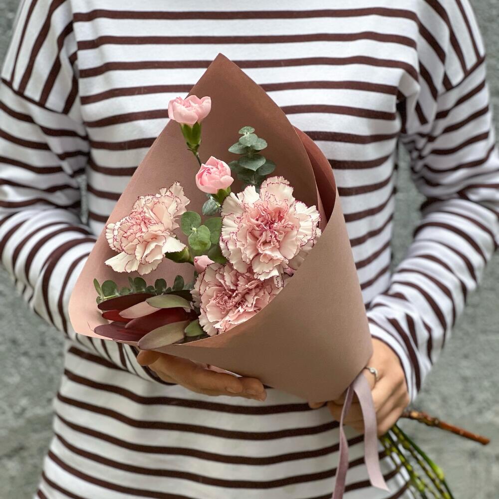 11 нежно-розовых диантусов с эвкалиптом