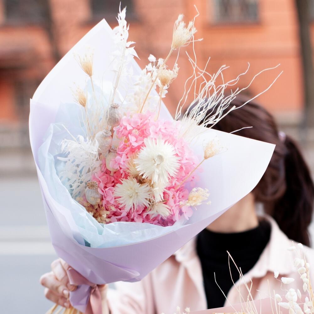 гортензия стабилизированная – 1 шт.Ковыль – 20 шт.Гелихризум – 7 шт.мак декоративный – 4 шт.рускус стабилизированный – 3 шт.Упаковка дизайнерская – 1 шт.
