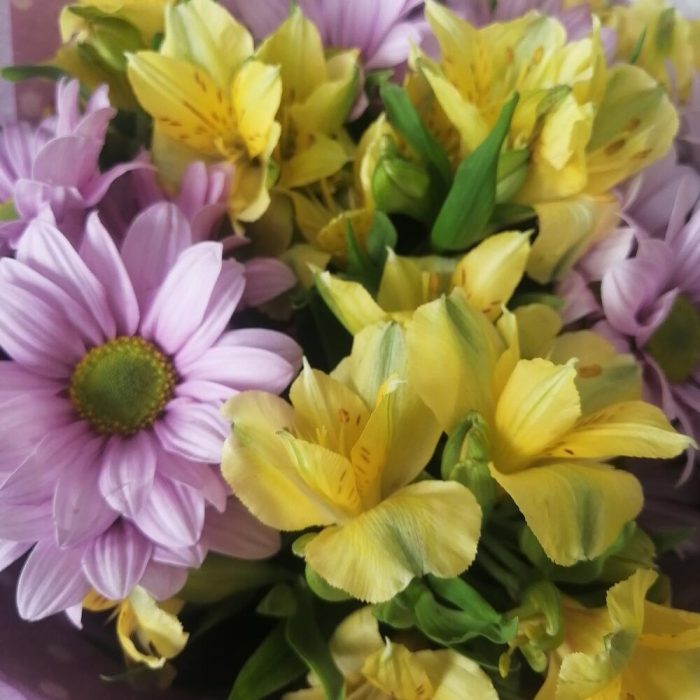 Альстромерия – 4 шт.Хризантема кустовая – 3 шт.Упаковка – 1 шт.