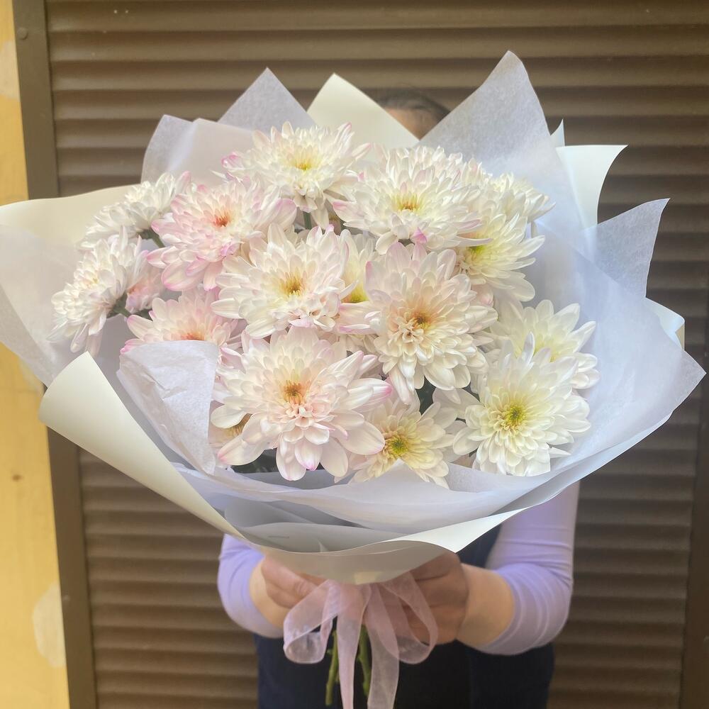 Хризантема кустовая – 5 шт.Лента атласная – 1 шт.Тишью белое – 1 шт.Пленка дизайнерская – 2 шт.