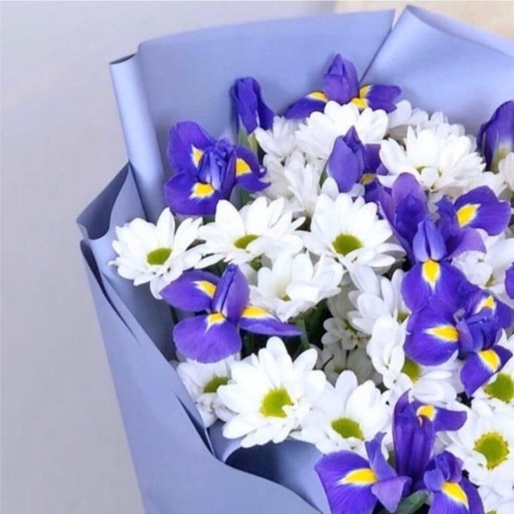 Ирис – 15 шт.Хризантема кустовая – 6 шт.Лента атласная – 2 шт.Упаковка дизайнерская – 3 шт.