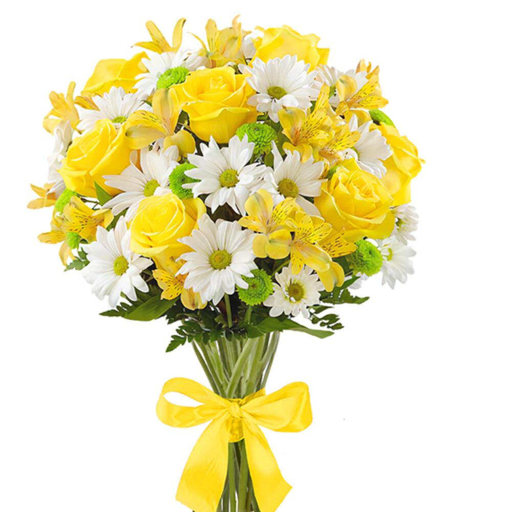 Папоротник – 1 шт.хризантема кустовая (белый) – 5 шт.альстромерия (желтый) – 5 шт.лента атласная (желтый) – 1 шт.