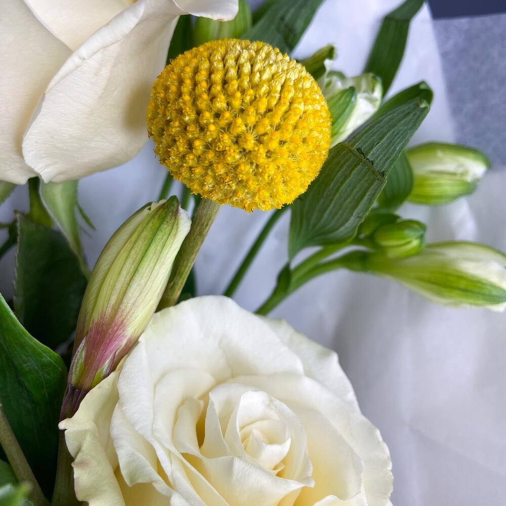 Роза Мондиаль – 3 шт.Краспедия желтая – 1 шт.Альстромерия – 2 шт.лизиантус розита вайт – 1 шт.Упаковка – 1 шт.
