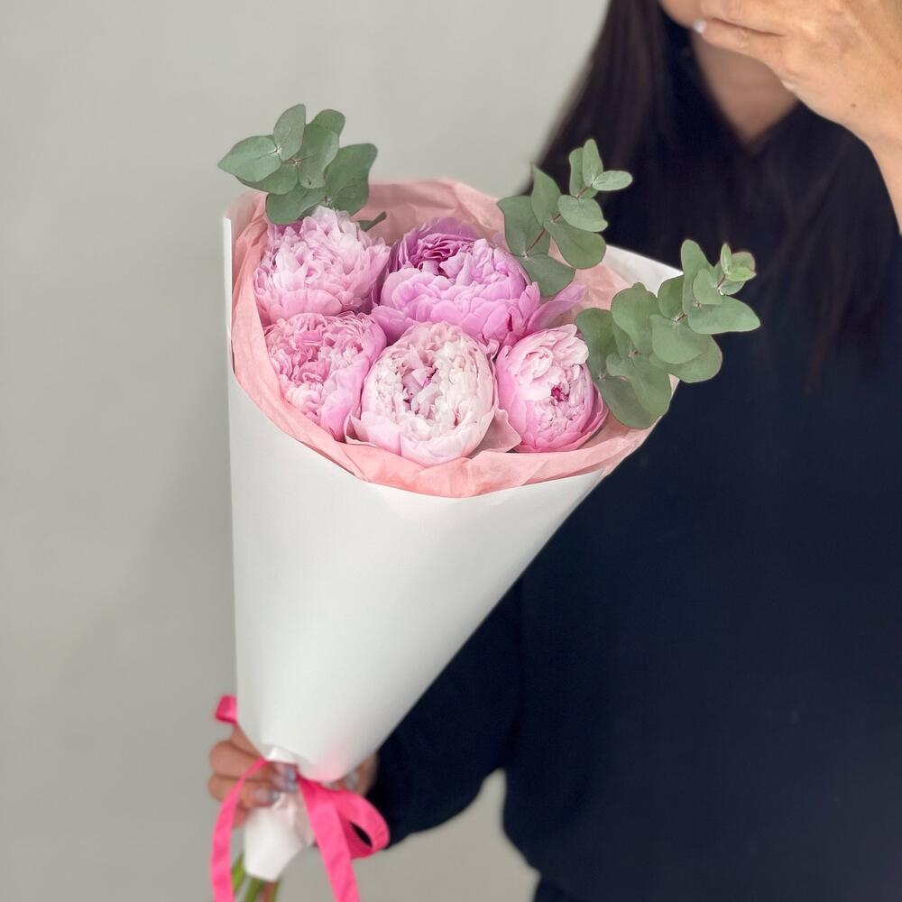 5 розовых пионов с эвкалиптом