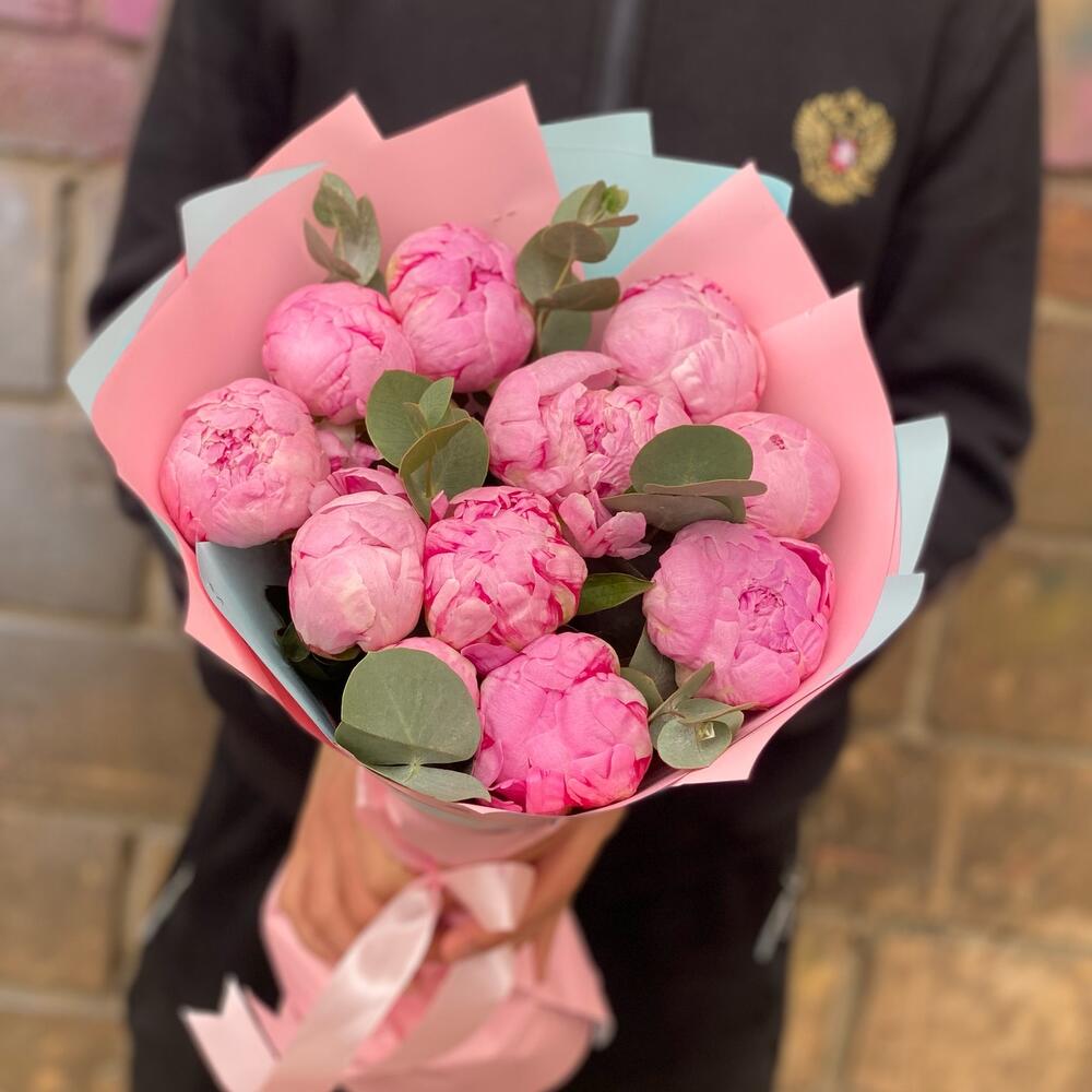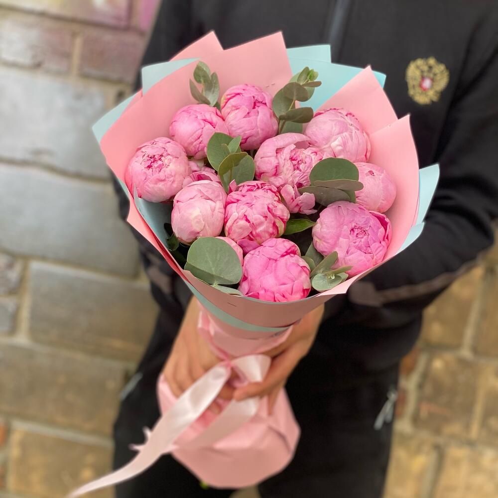 Букет из 11 пионов с эвкалиптом