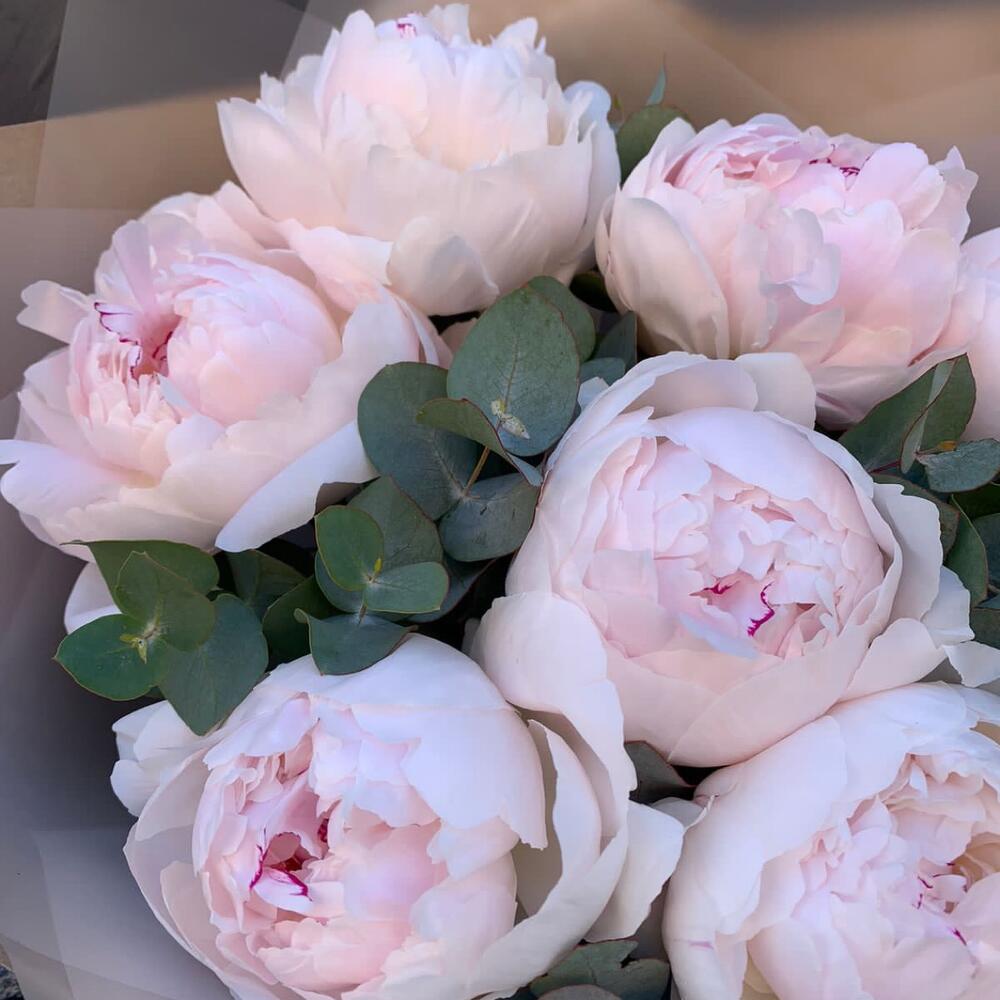 Пион – 7 шт.Эвкалипт – 10 шт.Упаковка дизайнерская – 2 шт.Лента атласная – 1 шт.