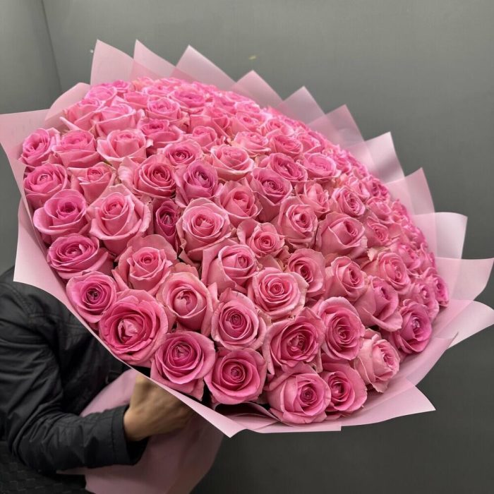 Лента атласная – 1 шт.Дизайнерская упаковка – 5 шт.розы эквадор (60 см) – 101 шт.