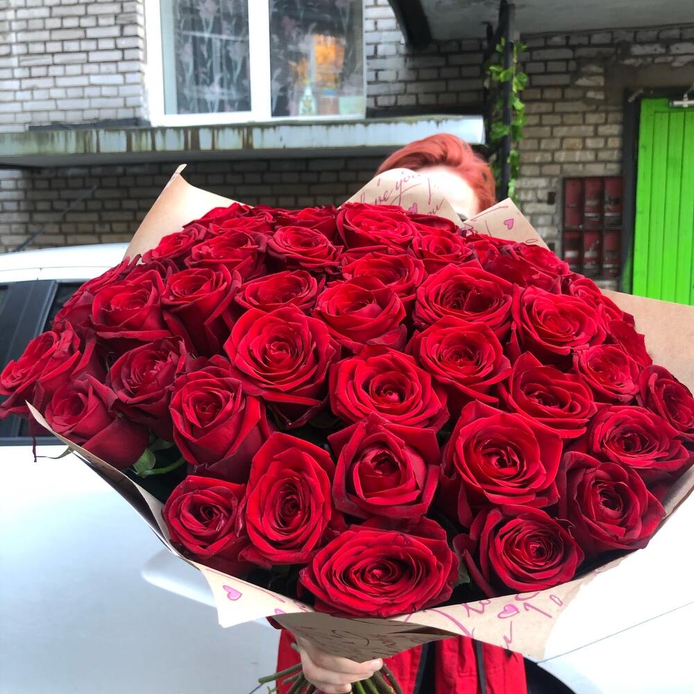 розы эквадор (60 см)красные – 51 шт.Крафт упаковка – 2 шт.Лента атласная – 1 шт.