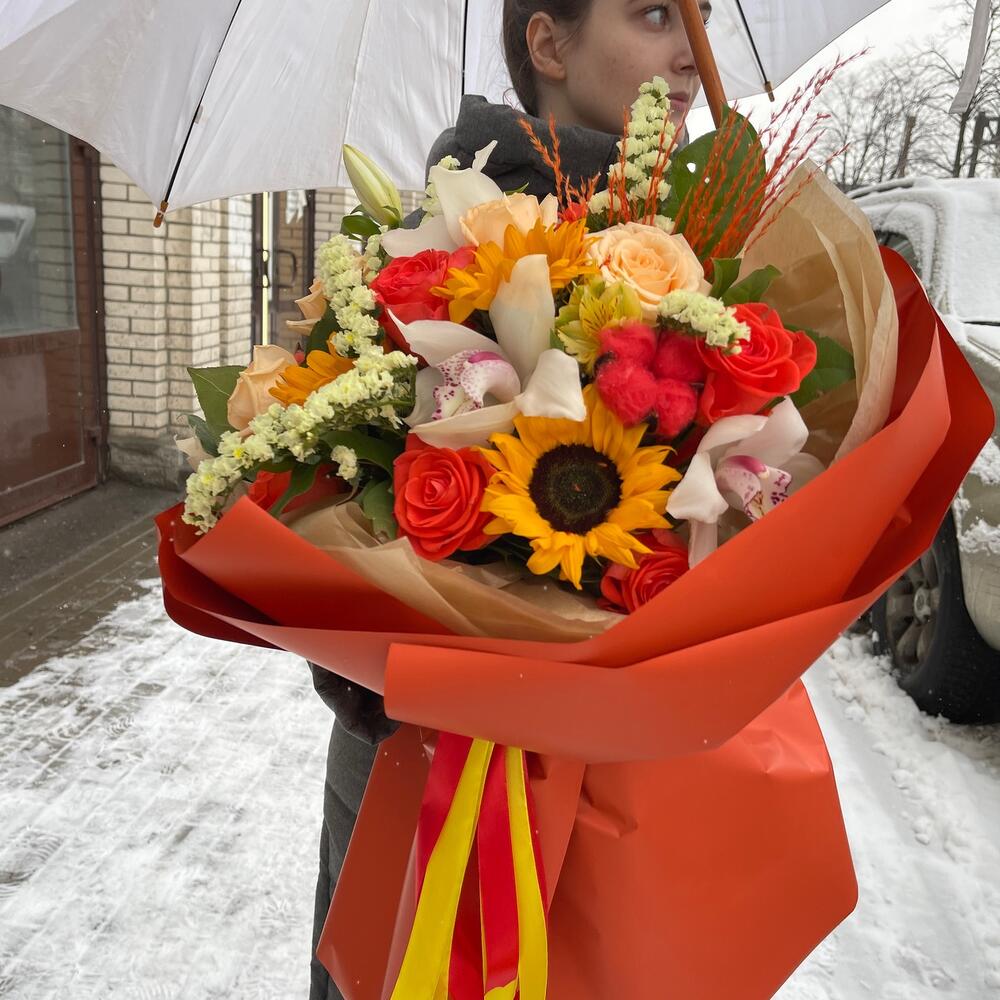 Альстромерия – 1 шт.Орхидея Цимбидиум – 3 шт.Статица – 3 шт.Роза Россия – 9 шт.Подсолнух – 3 шт.Пленка матовая – 6 шт.Салал пучок – 1 шт.сухоцвета – 10 шт.