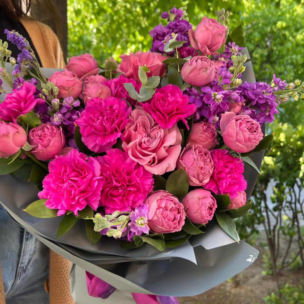 Маттиола – 7 шт.Роза пионовидная – 2 шт.Гвоздика – 8 шт.Роза кустовая – 3 шт.Эвкалипт – 2 шт.уракрвка дизайнерская – 1 шт.Зелень – 1 шт.