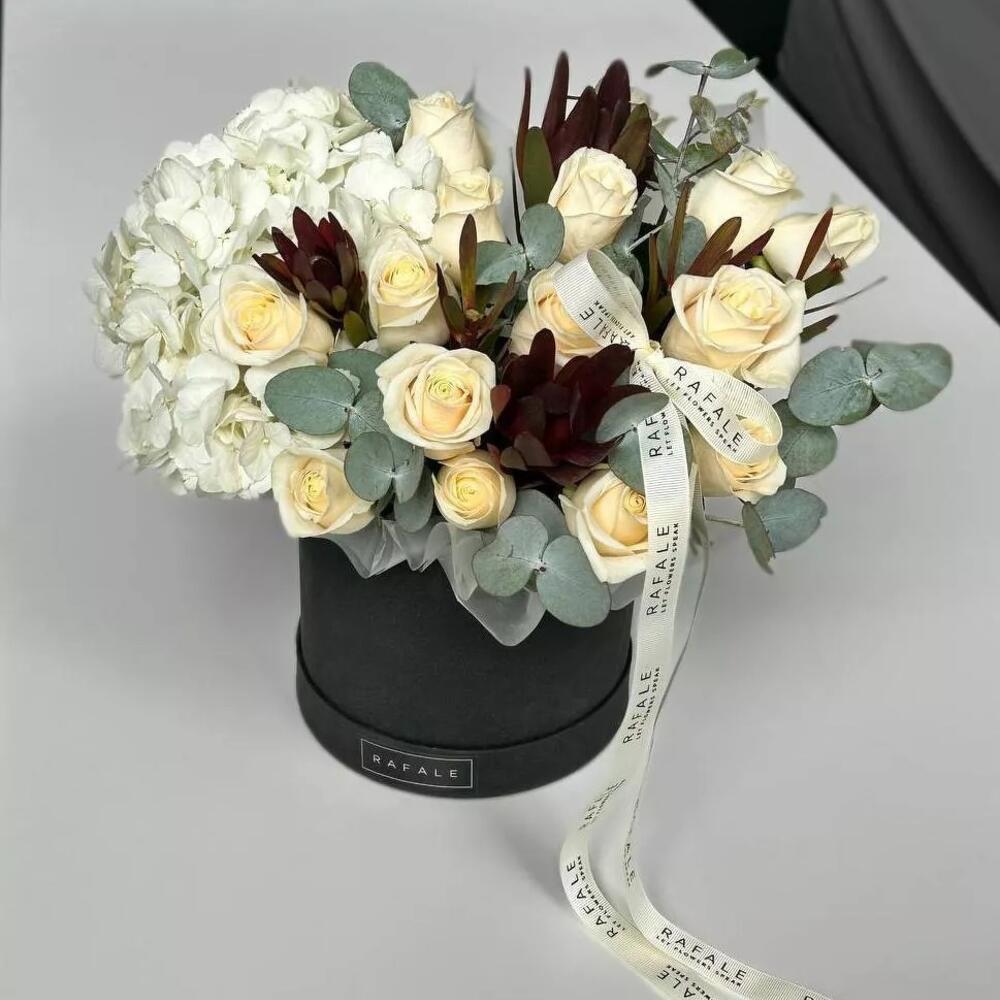 Букет "BOX 20.0" состоит из 15 голландских роз, 1 голландской гортензии, 1 ветки сафари и 2 веток эвкалипта в коробку. Эта композиция — идеальный способ рассказать о чувствах. Будь то начало отношений, важная для Вас обоих дата или просто знак внимания любимой. Выбрав букет от RAFALE, Вы скрасите день обладательницы букета и подарите ей незабываемые эмоции.