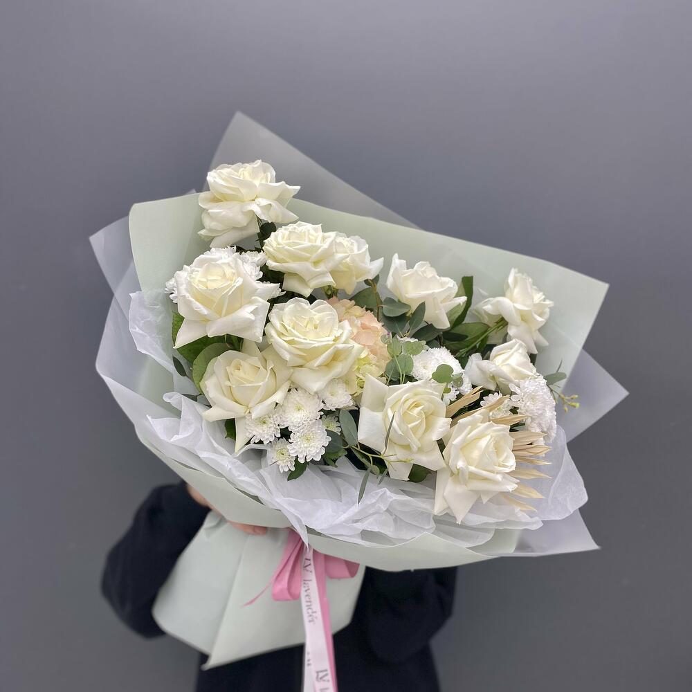 Альстромерии, Кустовые розы, Лизиантусы, Пионовидные розы, Розы, Ромашки