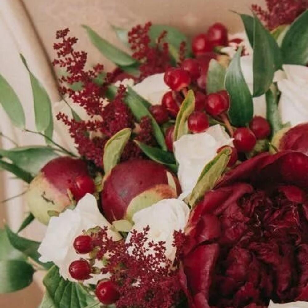 пионы бордовые – 9 шт.Роза одноголовая – 7 шт.Хиперикум красный – 5 шт.зелень декоративная – 15 шт.Лента атласная – 2 шт.