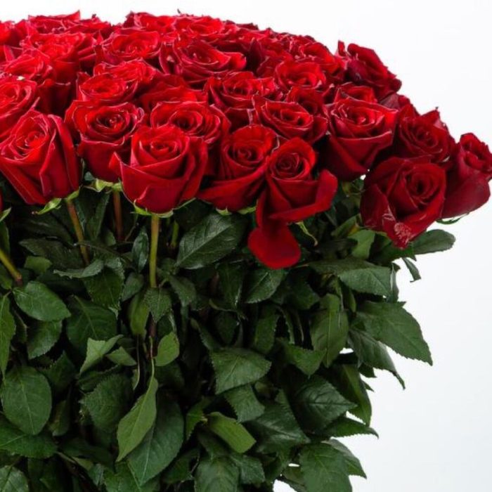Роза голландская красная – 101 шт.Лента атласная – 2 шт.Открыточка с вашими пожеланиями – 1 шт.хорошее настроение – 100 шт.инструкция по уходу за цветами – 1 шт.коробка переноска – 1 шт.Кризал – 1 шт.