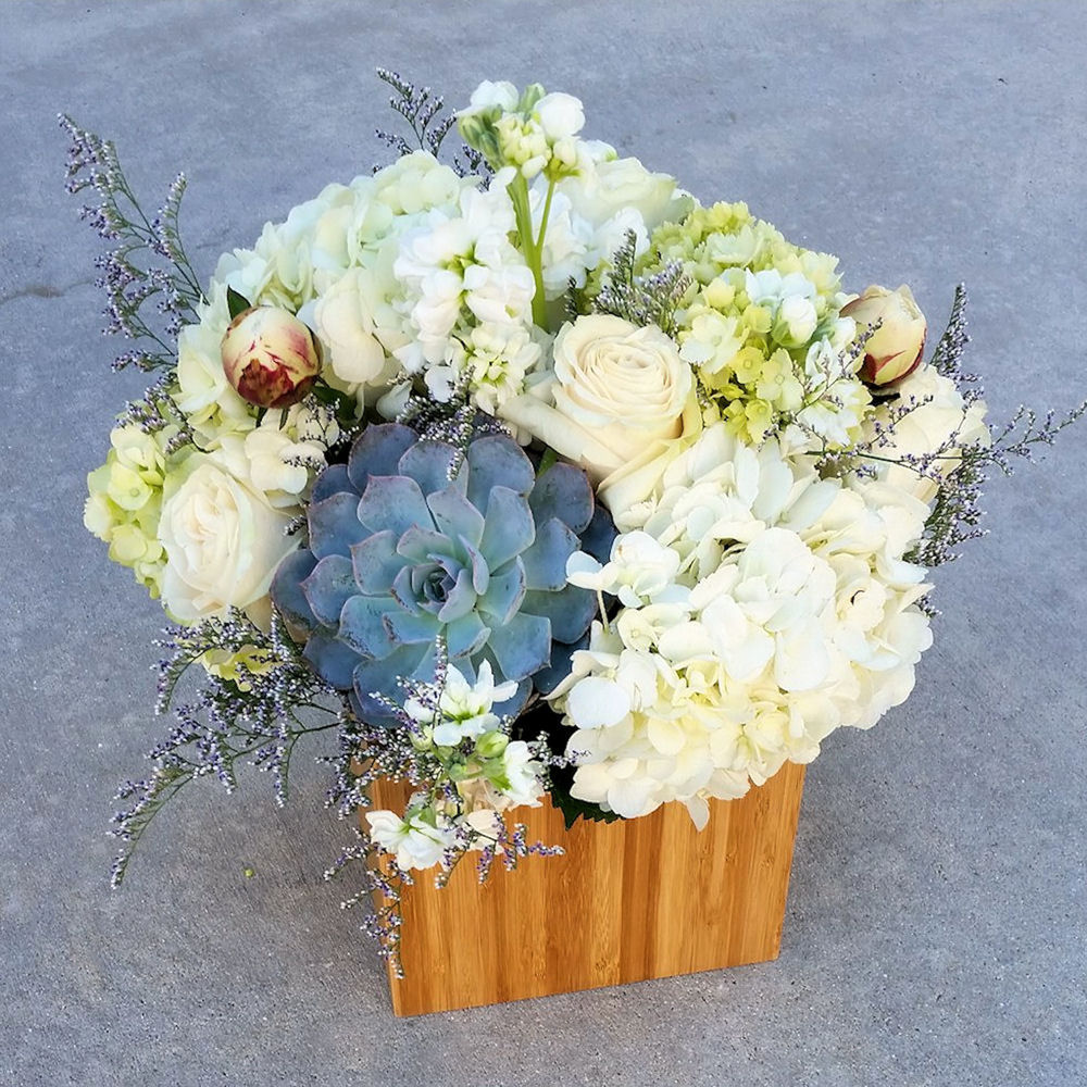 Гипсофила розовая – 6 шт.Роза белая – 5 шт.Гортензия белая – 3 шт.Маттиола белая – 3 шт.Пион – 2 шт.Эхеверия – 1 шт.Ящик деревянный – 1 шт.Гортензия зеленая – 1 шт.