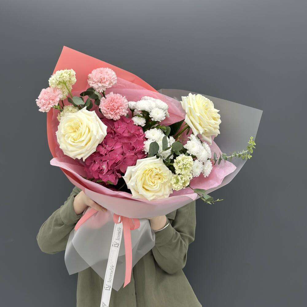 Альстромерии, Гортензии, Кустовые розы, Лизиантусы, Розы, Хризантемы