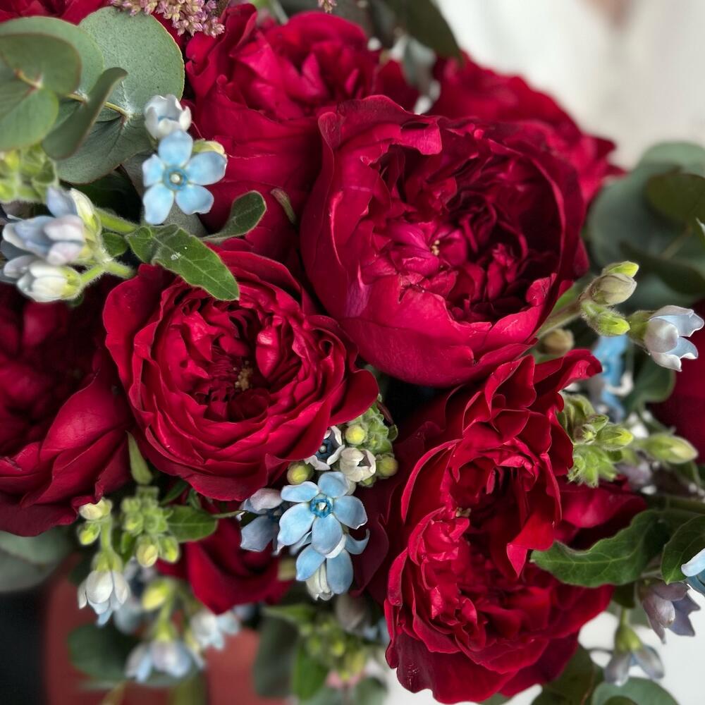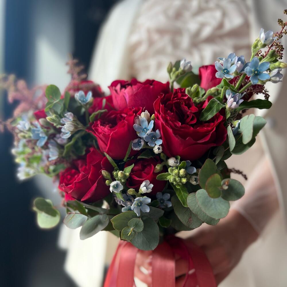 Астильба – 5 шт.Эвкалипт – 5 шт.Пионовидная роза – 9 шт.Атласная лента – 2 шт.Оксипеталум – 7 шт.