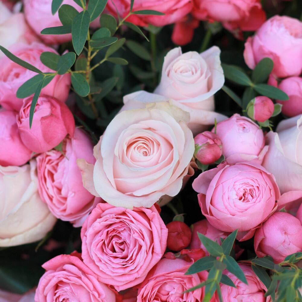 Альстромерии, Кустовые розы, Лизиантусы, Пионовидные розы, Розы, Ромашки