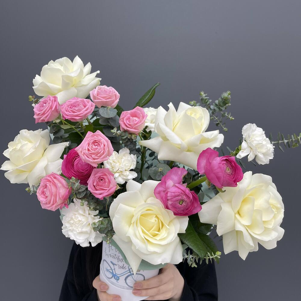 Альстромерии, Гвоздики, Кустовые розы, Лизиантусы, Розы, Хризантемы