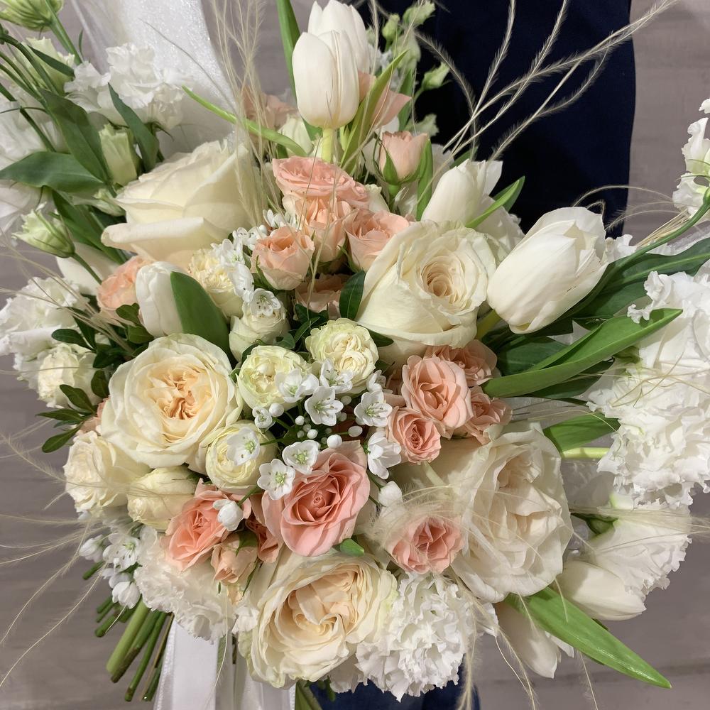 роза пионовидная «вайт о’хара» – 7 шт.роза кустовая пионовидная «miss bombastic» – 10 шт.Роза кустовая – 10 шт.эустома махровая – 10 шт.аллиум неаполитанум – 7 шт.тюльпан премиум белый – 20 шт.Ковыль – 20 шт.Питтоспорум – 5 шт.Писташ – 5 шт.декор ручной работы «крылья» – 1 шт.