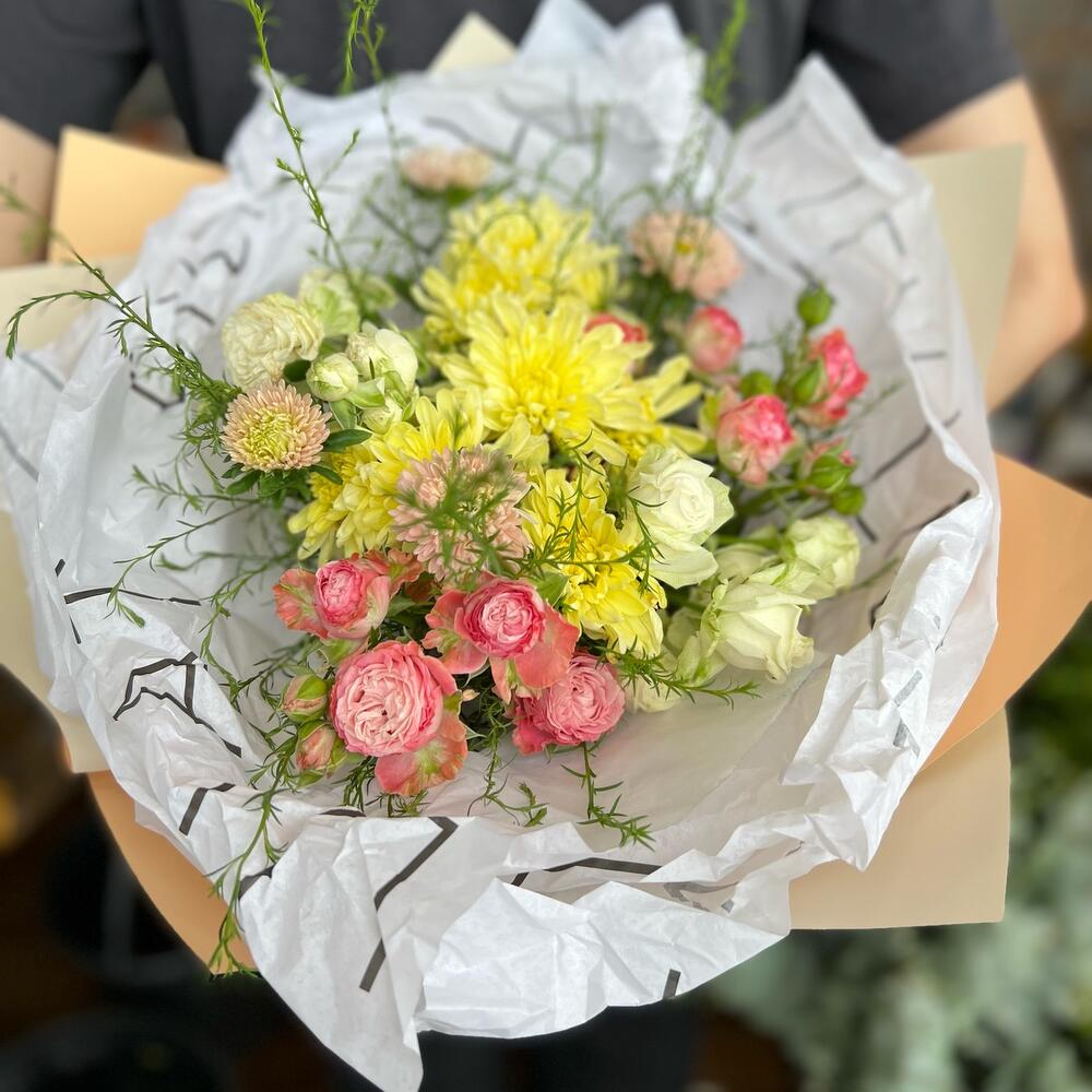 Хризантема – 5 шт. Кустовая роза – 3 шт. Зелень – 3 шт.
