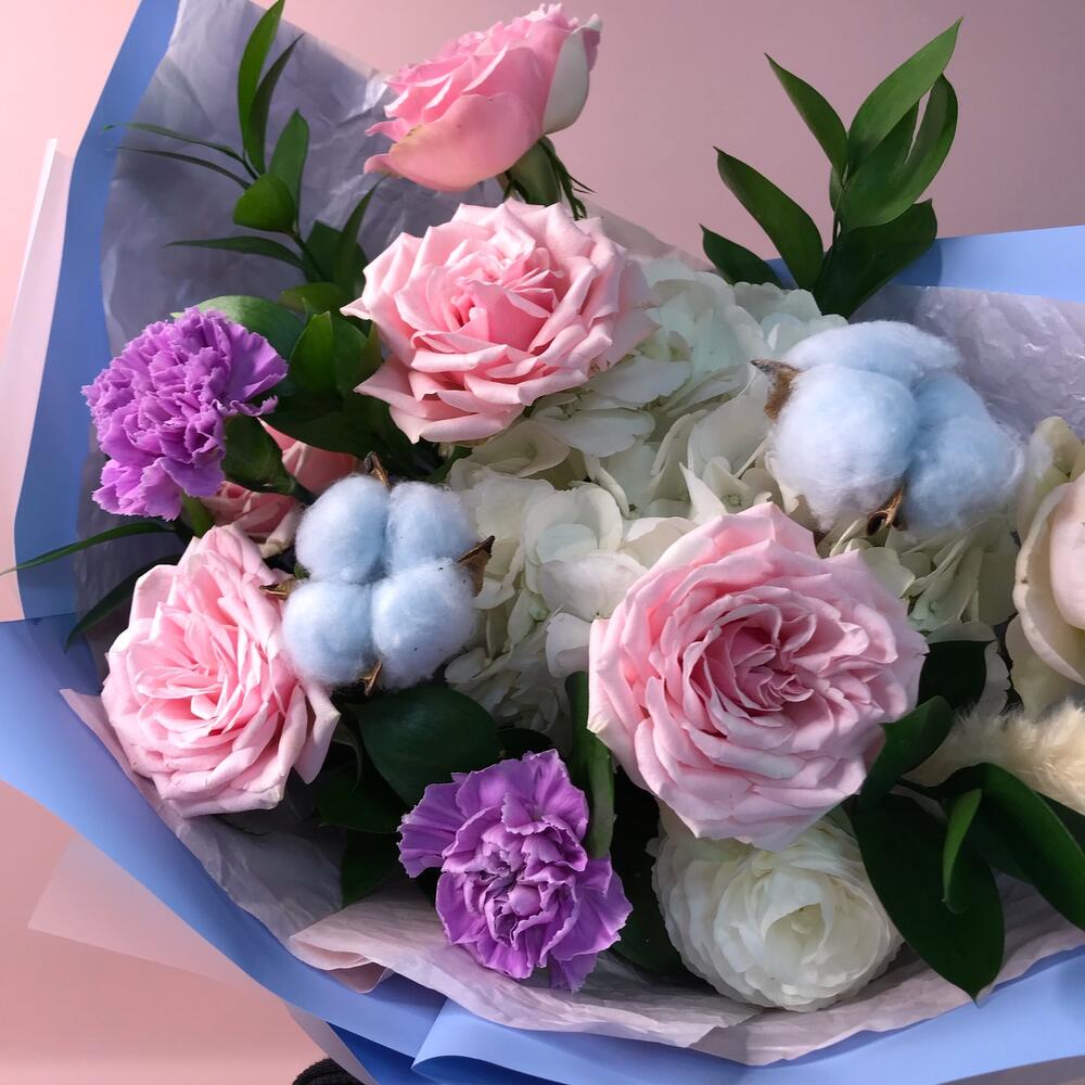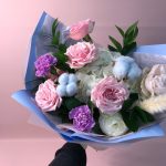Гортензия – 1 шт.Рускус – 7 шт.Салал – 7 шт.Тишью – 4 шт.Ранункулюс – 1 шт.Роза садовая – 3 шт.Оформление – 1 шт.хлопок сухоцвет – 2 шт.ковыль сухоцвет – 1 шт.Диантус мун аква – 2 шт.Пион Италия – 1 шт.