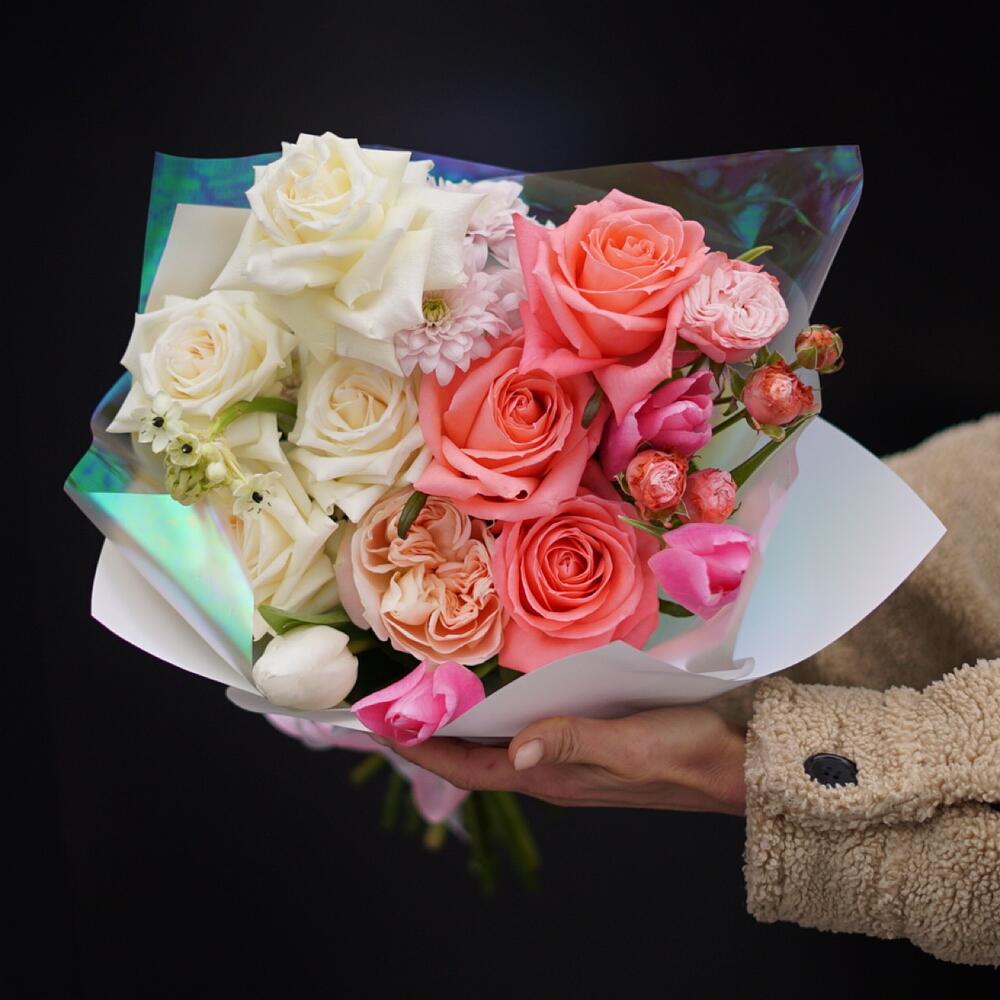 Роза цветная – 7 шт. Роза пионовидная – 1 шт. Кустовая роза – 2 шт. Тюльпан – 3 шт. Хризантема – 3 шт. Орнитогалум – 1 шт. Упаковка дизайнерская – 2 шт. Открыточка с вашими пожеланиями – 1 шт. инструкция по уходу за цветами – 1 шт.