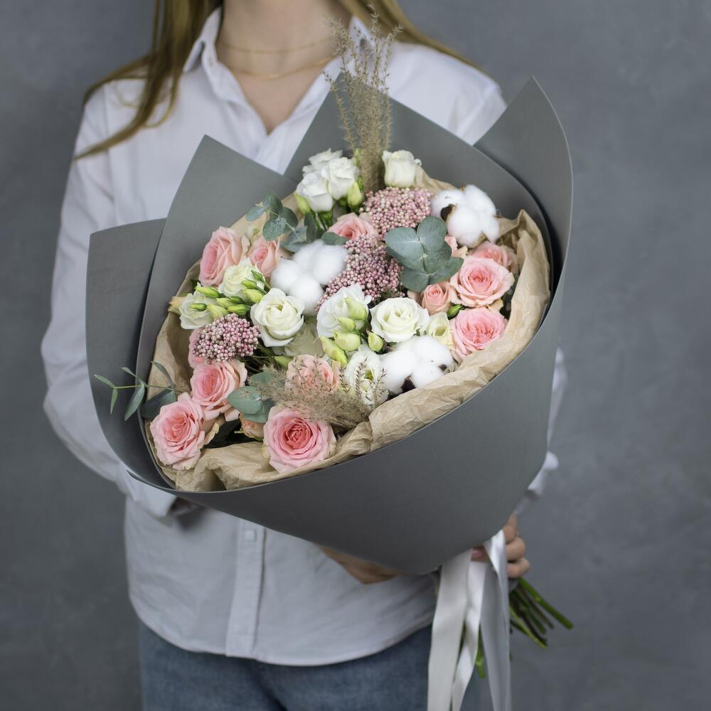 Озотамнус – 3 шт.Хлопок – 3 шт.Лизиантус – 3 шт.Кустовая роза – 3 шт.Эвкалипт – 5 шт.эулалия – 2 шт.Упаковка – 2 шт.