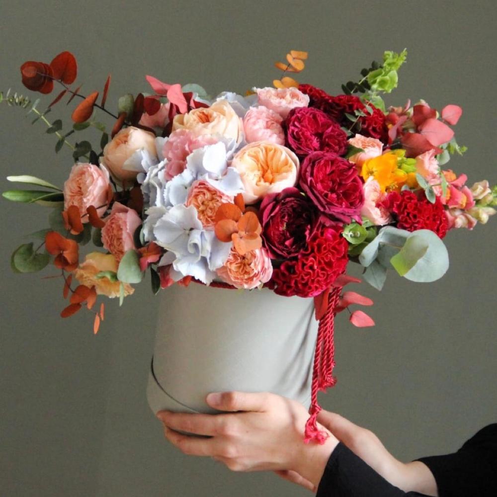 Целозия – 3 шт.Пионовидная роза – 9 шт.Кустовая пионовидная роза – 3 шт.Гортензия – 1 шт.Орнитогалум – 2 шт.Львиный зев – 2 шт.Диантус – 3 шт.Эвкалипт – 5 шт.Шляпная коробка – 1 шт.шнур декоративный – 1 шт.Оазис флористический – 1 шт.