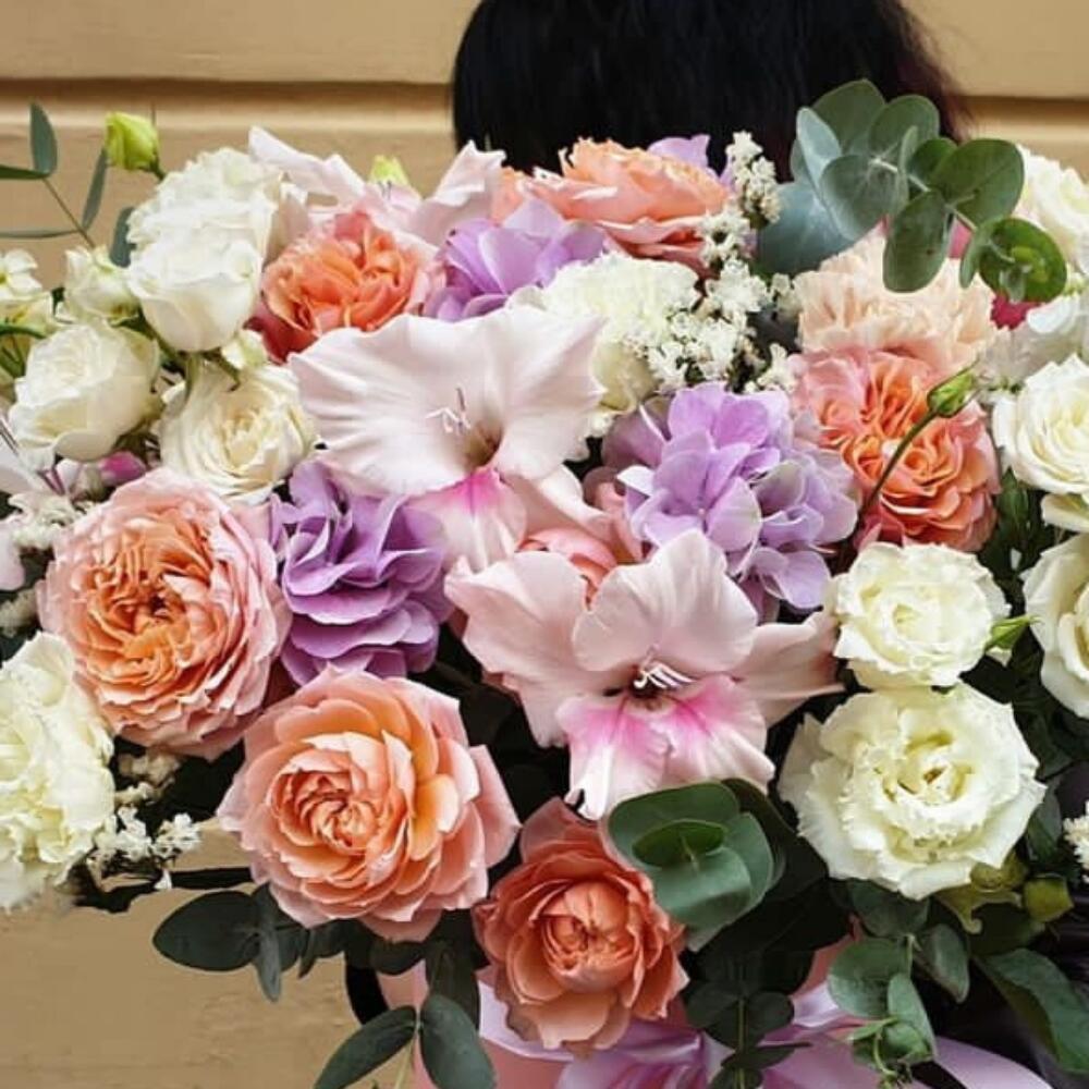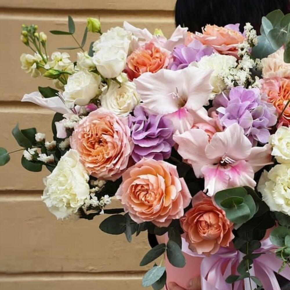Коробка шляпная – 1 шт.Оазис флористический – 1 шт.Лента атласная – 2 шт.Калька упаковка – 1 шт.Гортензия – 1 шт.Гладиолус – 2 шт.роза пионовидная джульетта кустовая – 4 шт.Маттиола – 3 шт.эустома белая – 3 шт.Статица – 3 шт.Эвкалипт – 7 шт.Роза кустовая белая – 4 шт.