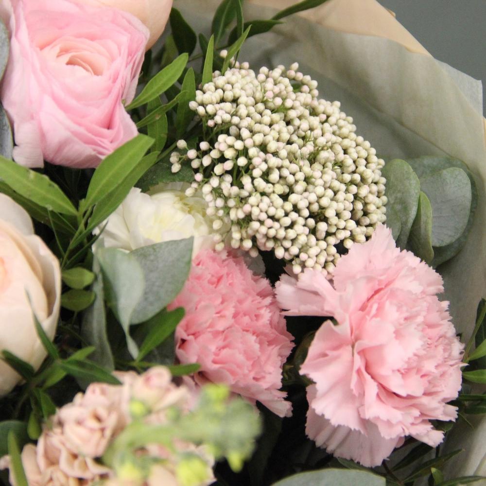 Нежный букет с английскими пионовидными розами, душистой маттиолой, эвкалиптом, озотамнусом и гвоздиками.