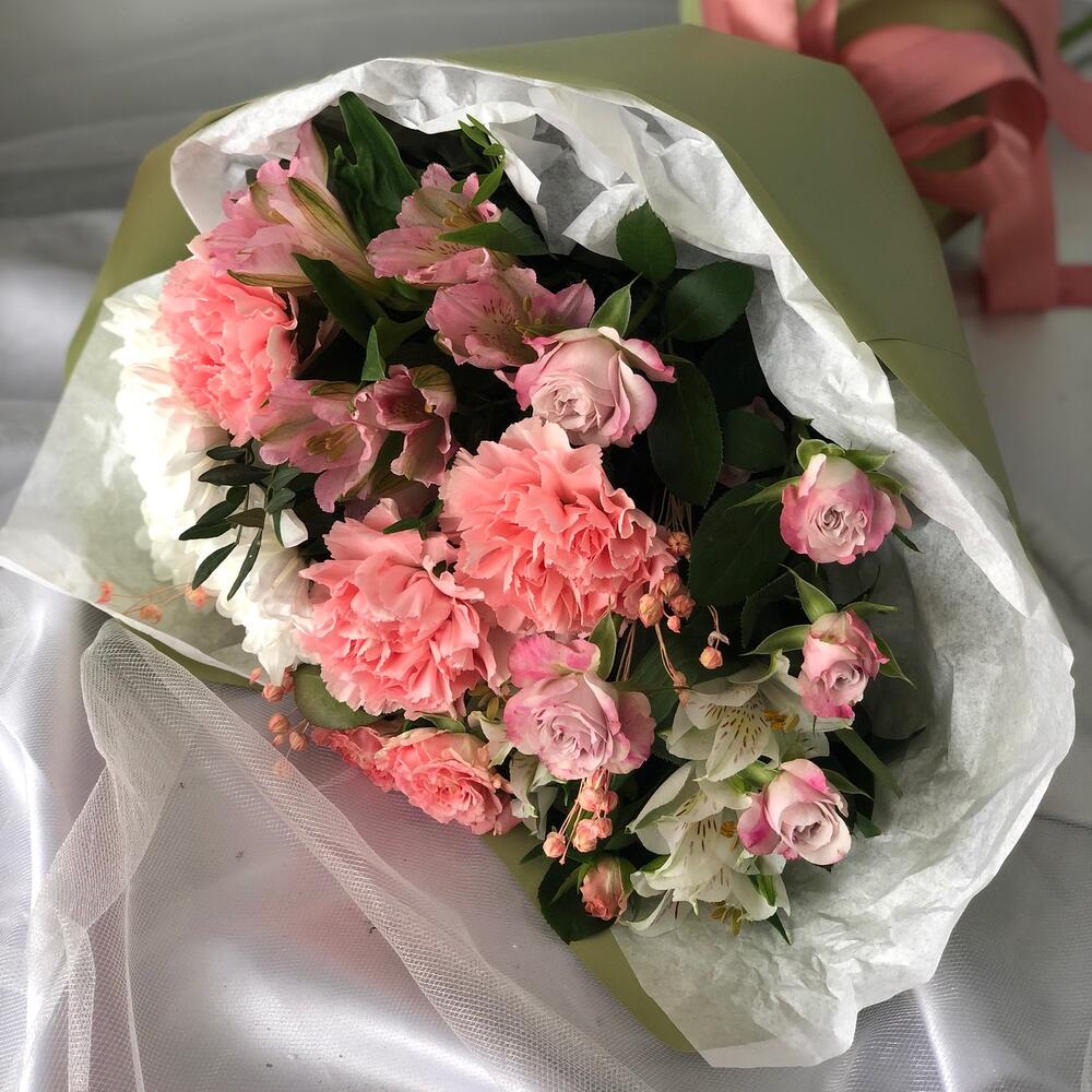 Нежный, сборный букет с кустовыми розами, альстромериями, сухоцветами, сортовыми гвоздиками и кустовой хризантемой