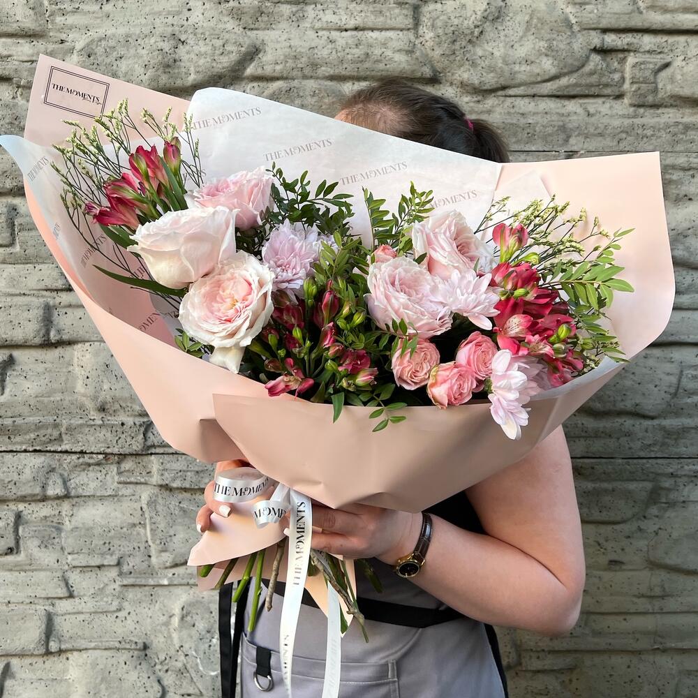 Альстромерии, Кустовые розы, Лизиантусы, Пионовидные розы, Розы, Ромашки