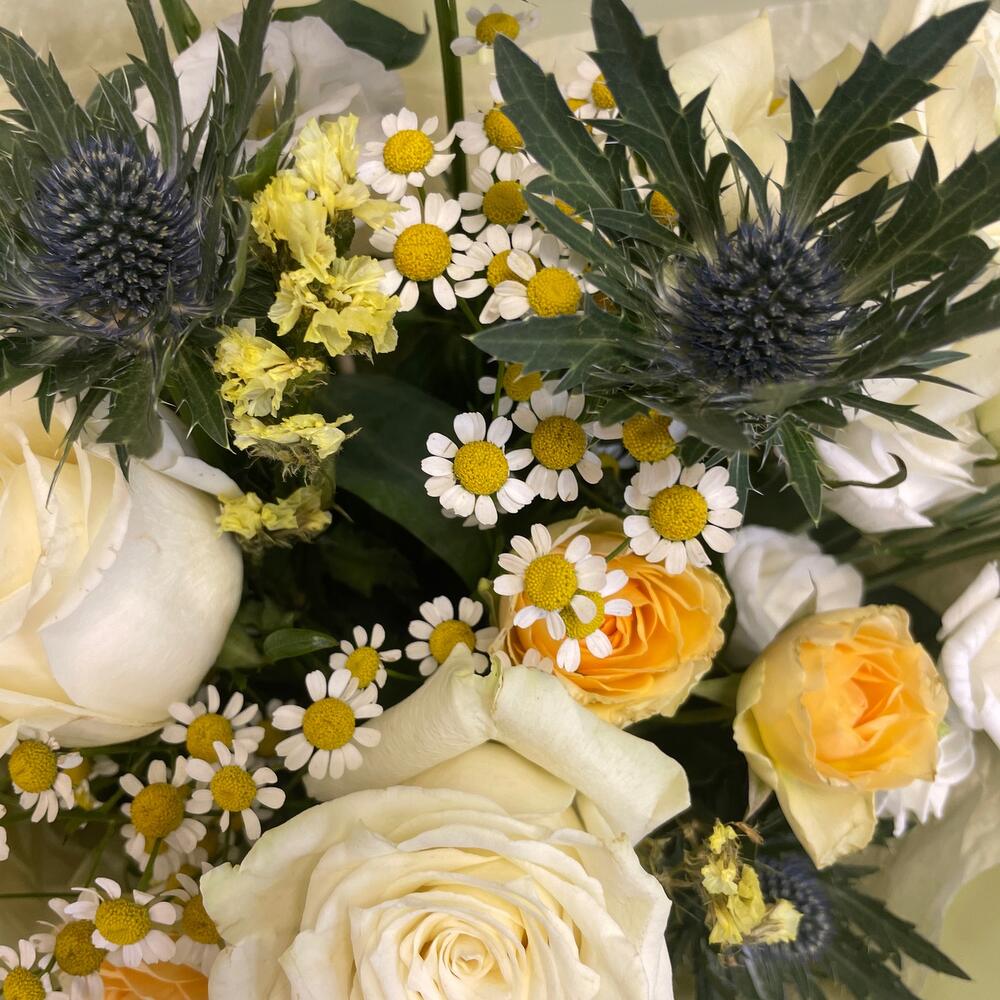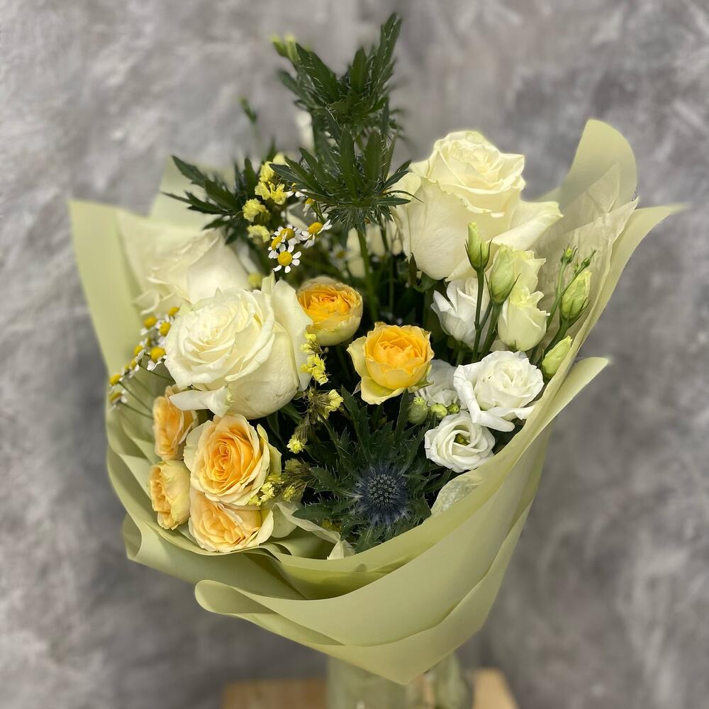 Эквадор роза – 3 шт.Кустовая роза – 2 шт.Танацетум – 2 шт.Лизиантус – 2 шт.Статица – 1 шт.Эрингиум – 4 шт.Упаковка – 1 шт.Лента атласная – 1 шт.