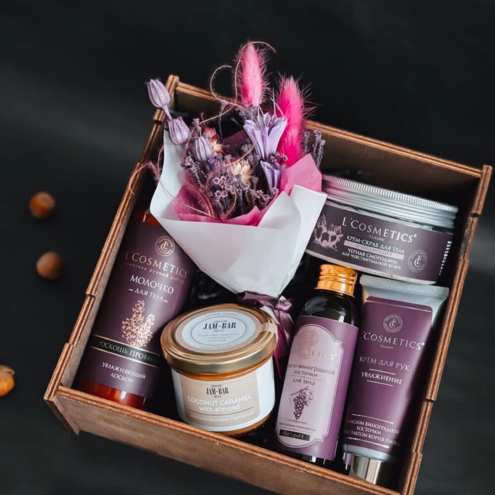 Деревянная коробка – 1 шт.букет сухоцветов – 1 шт.крем для рук l’cosmetic увлажнение – 75 млмолочко для тела роскошь прованса l’cosmetic – 200 млкокосовая карамель bon marche spb – 100 гр.масло виноградной косточкой l’cosmetic – 100 млкрем скраб для тела черная смородина l’cosmetic – 1 шт.
