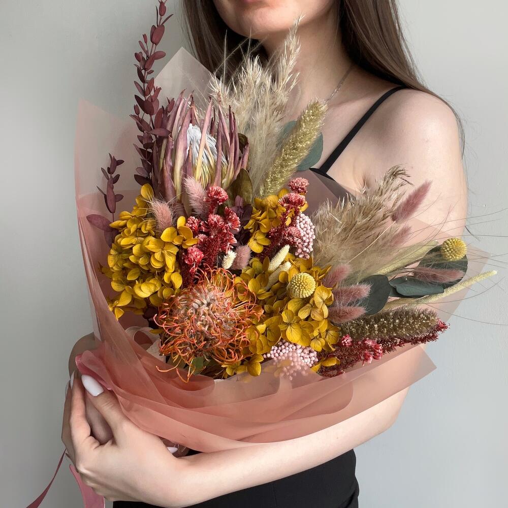 Гортензия – 1 шт.Озотамнус – 1 шт.Протея – 1 шт.Эвкалипт – 3 шт.Нутан – 1 шт.Капс – 1 шт.Упаковка дизайнерская – 1 шт.Ковыль – 2 шт.Лагурус – 9 шт.Сетария – 2 шт.Флум – 9 шт.пампас – 1 шт.
