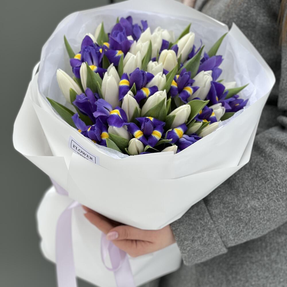 Тюльпан белый – 31 шт. ирисы – 15 шт. Писташ – 5 шт. Оформление – 1 шт.